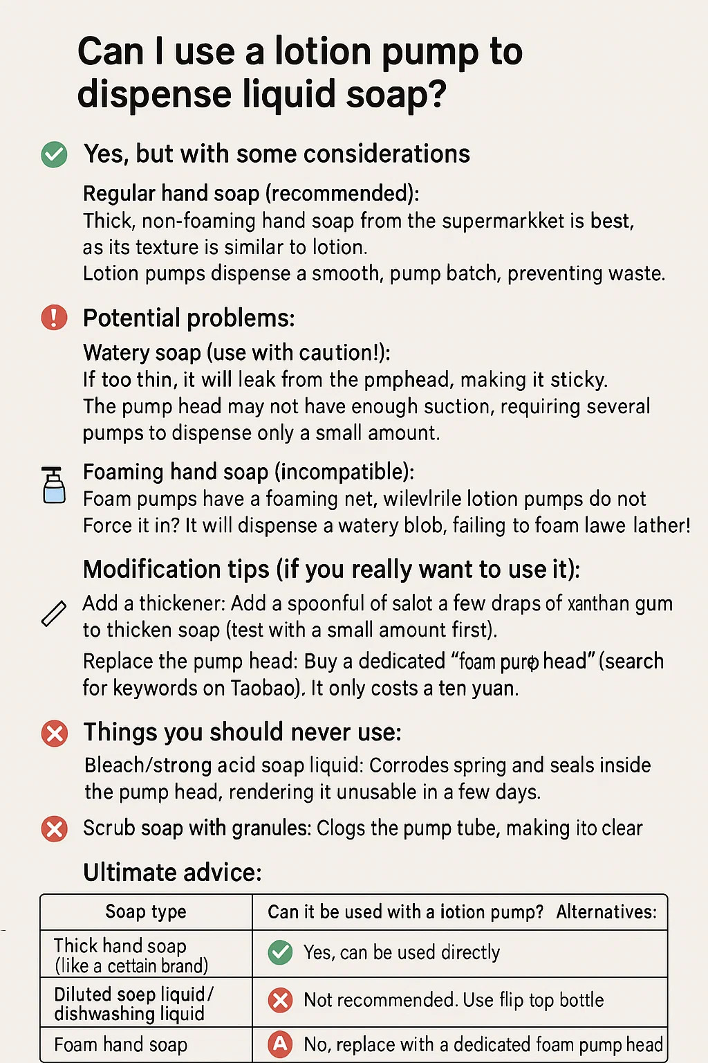 • Пенящееся мыло для рук (несовместимо): насосы для пены имеют пенообразующую сетку, а насосы для лосьона — нет.