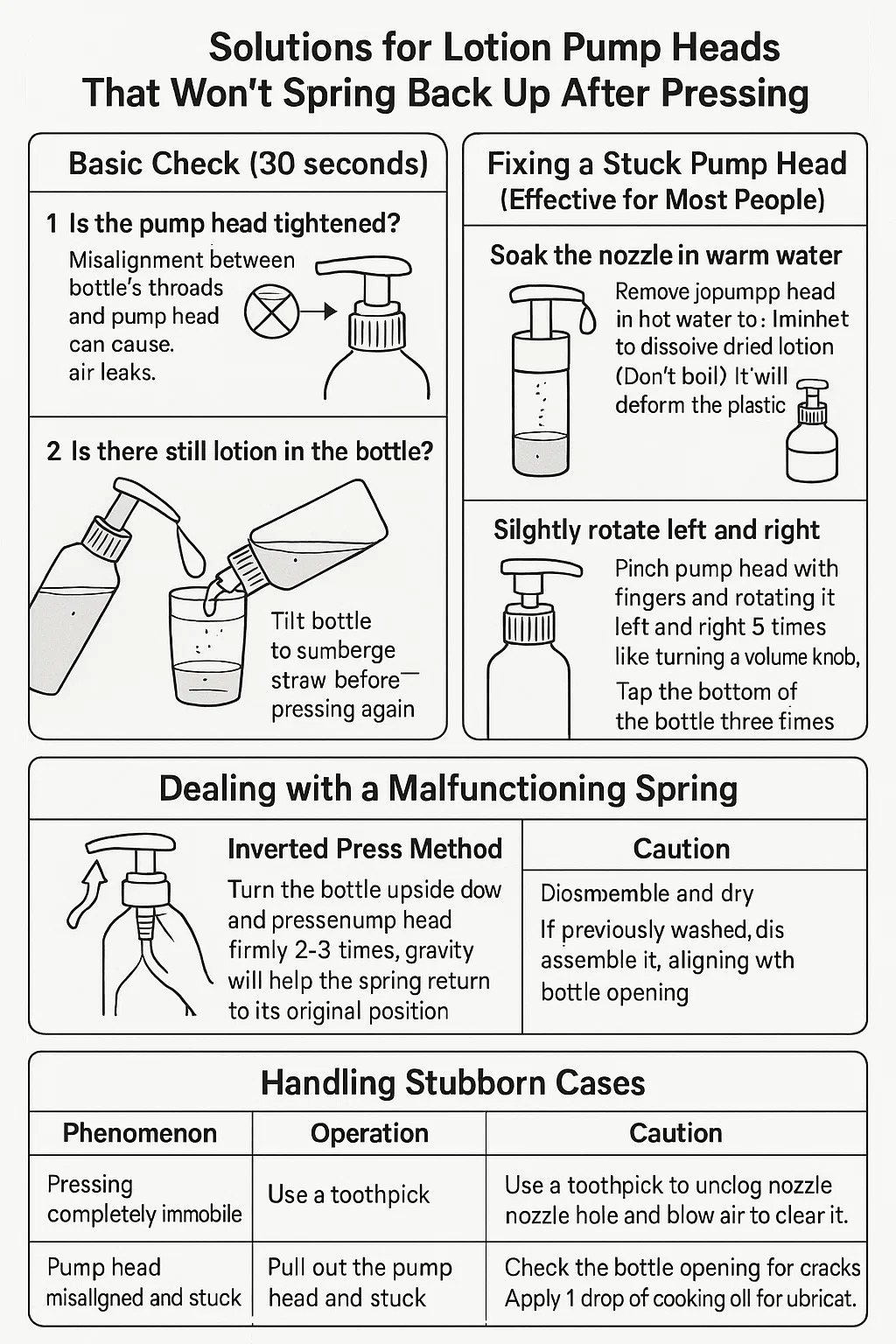 | Кривая/заклинившая головка насоса | Снимите, совместите с горлышком бутылки, переустановите. | Сначала проверьте горлышко бутылки на наличие трещин. |