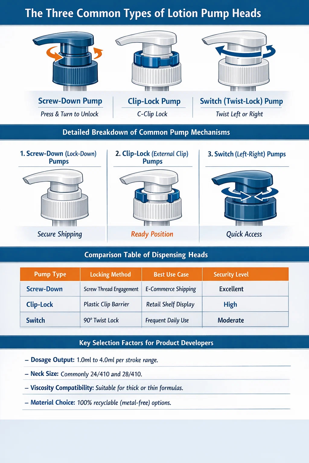Также известные как насосы с поворотным замком, они не «выскакивают». Вместо этого пользователь вращает головка насоса для лосьона На 90 градусов для выравнивания внутреннего канала дозирования. Этот тип идеально подходит для средств для душа например, шампуни и средства для мытья тела, когда пользователю может потребоваться часто запирать бутылку между использованиями.
