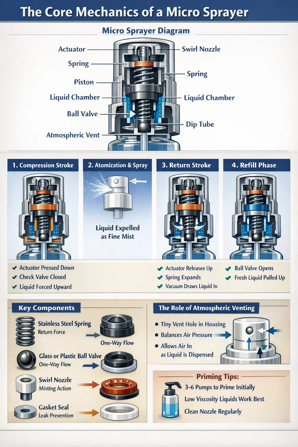 Фундаментальное принцип работы микрораспылителя основан на вытеснении жидкости и атмосферного давления, в частности с использованием механизм объемного насоса . Когда привод нажат, он сжимает пружину и уменьшает объем внутри небольшой камеры, вытесняя жидкость через прецизионное сопло. При отпускании пружина тянет поршень назад, создавая вакуум который забирает свежую жидкость из бутылки через погружную трубку, чтобы заполнить камеру для следующего распыления.
